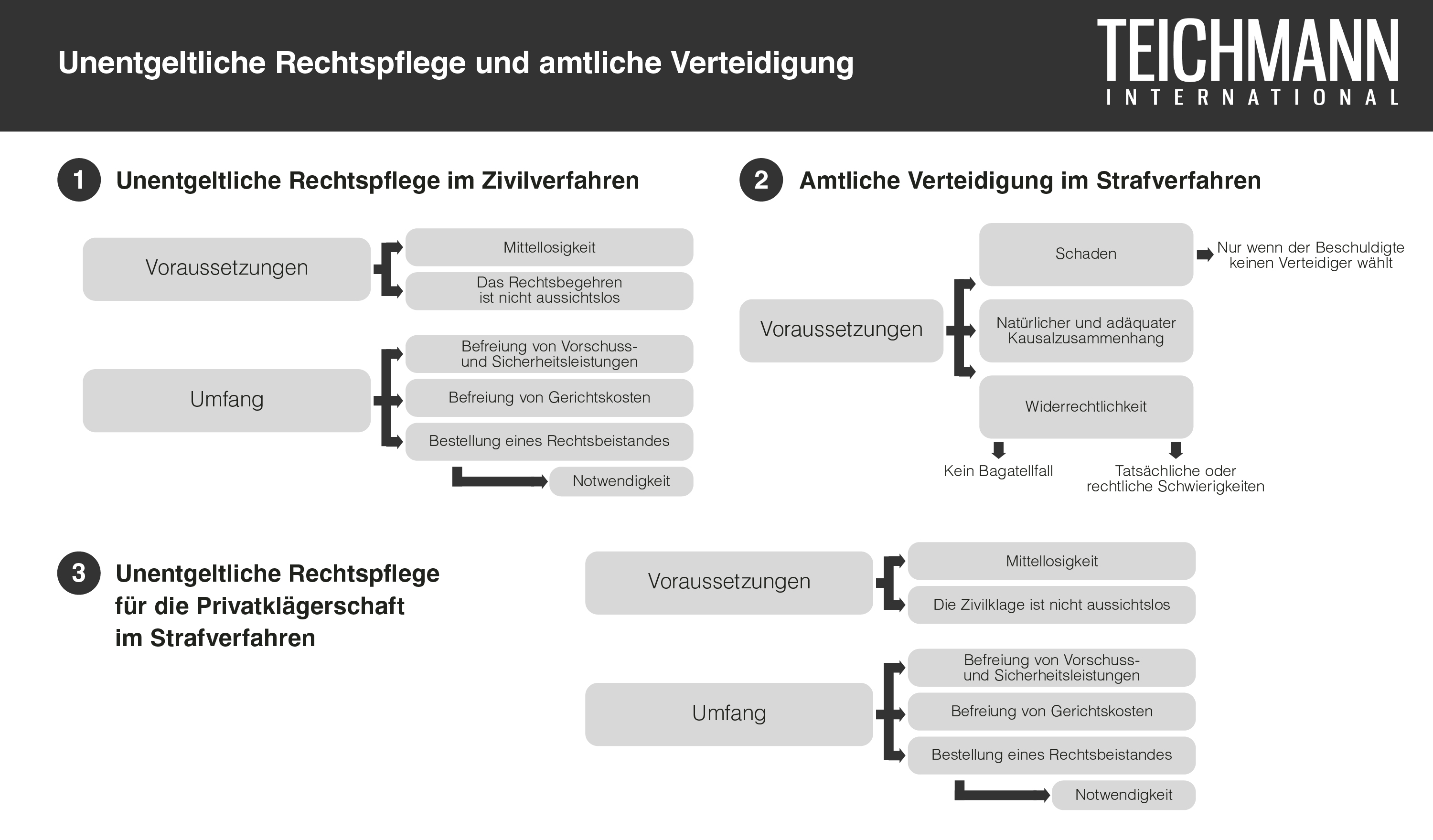 Dieser Anspruch auf unentgeltliche Rechtspflege ist in Art. 29 Abs. 3 der Bundesverfassung sowie Art. 117 ZPO geregelt. Der Artikel besagt, dass jede Person, die nicht über die erforderlichen Mittel verfügt, Anspruch auf unentgeltliche Rechtspflege hat. Als mittellos wird jene Partei bezeichnet, dessen Einkommen das betreibungsrechtliche Existenzminimum um maximal 500 CHF überschreitet und keine weiteren Vermögenswerte besitzt. Der Anspruch unterliegt jedoch einer Einschränkung. Das Rechtsbegehren darf nicht von vornherein schon aussichtlos erscheinen. Ebenfalls hat die Person nicht nur Anspruch auf die notwendigen Mittel, sondern auch Anspruch auf einen Rechtsbeistand, insbesondere wenn die Gegenpartei ebenfalls anwaltlich vertreten ist. Die unentgeltliche Rechtspflege steht schweizerischen sowie ausländischen Bürgern zu.