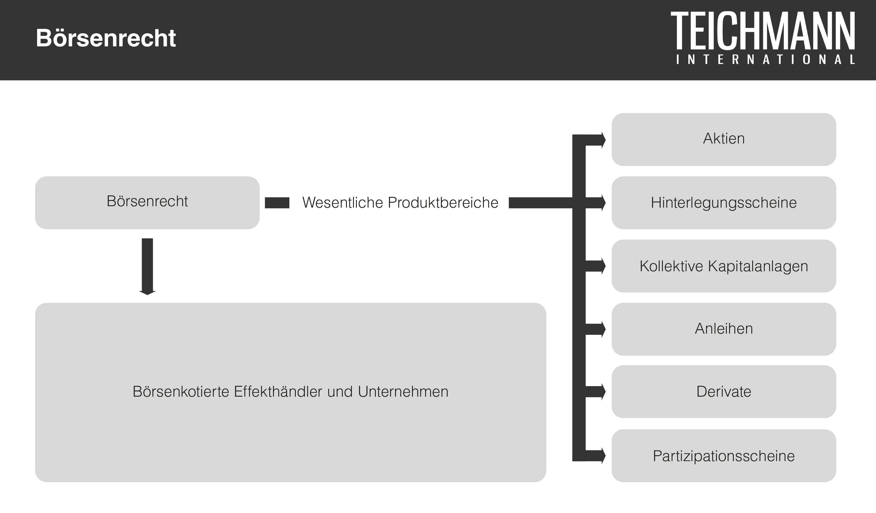 Das Börsenrecht reguliert EffekthändlerInnen und Unternehmen, welche an der Schweizer Börse kotiert sind. Hierzu zählen beispielsweise Emittenten, Banken und InvestorInnen. Relevant ist hierbei unter anderem der Produktbereich Aktien einschliesslich Hinterlegungsscheine, kollektive Kapitalanlagen, Anleihen und Derivate und Partizipationsscheine. Im Rahmen des Börsenrechts sind auch die Einhaltung der Corporate Governance und Compliance-Aspekte von grosser Wichtigkeit, beispielsweise in Zusammenhang mit Sanktionsverfahren gegen Börsen.